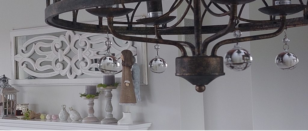 Projekt salonu w stylu prowansalskim – loftowa lampa i lustro z ornamentem – architekt wnętrz Krosno