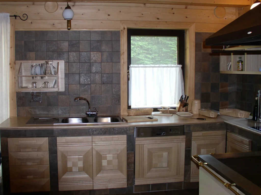 Zbliżenie na front szafki z mozaiką ze słojów drewna – detal mebla w stylu ludowym
