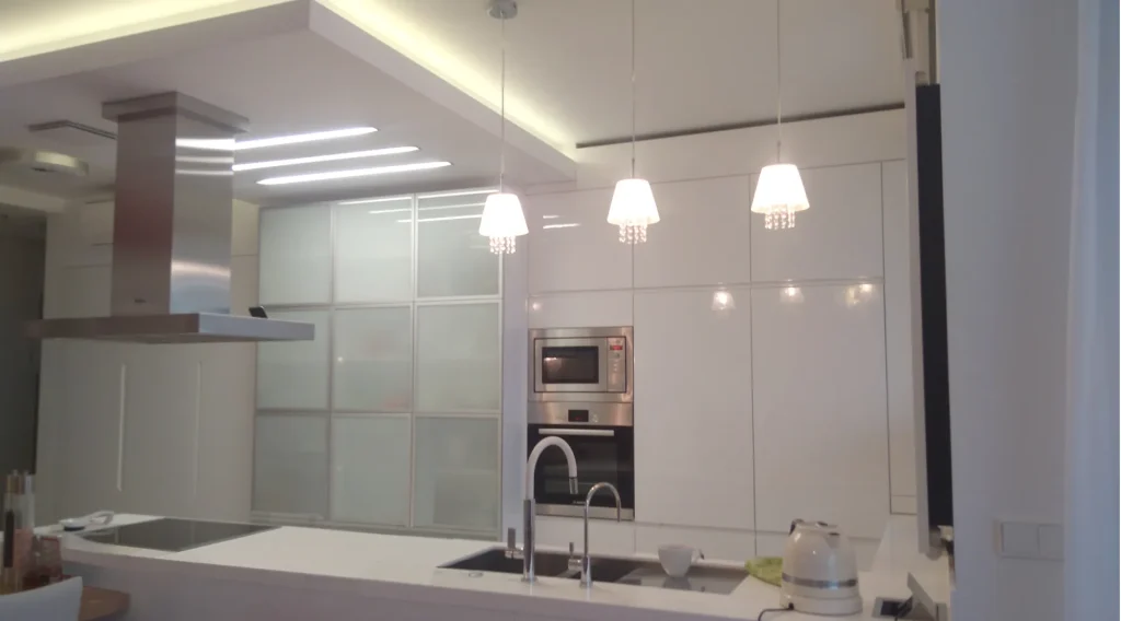 Projekt kuchni nowoczesnej – zabudowa meblowa z płyty białej w połysku, AGD w zabudowie, wyspa, obniżony sufit z oświetleniem pośrednim.