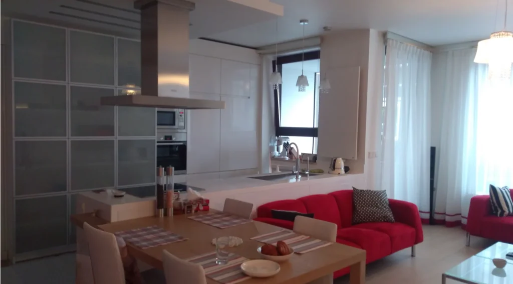 Projekt i wykonanie nowoczesnej kuchni w kolorze białym. Pośrodku znajduje się wyspa z blatem roboczym i stołem jadalnianym