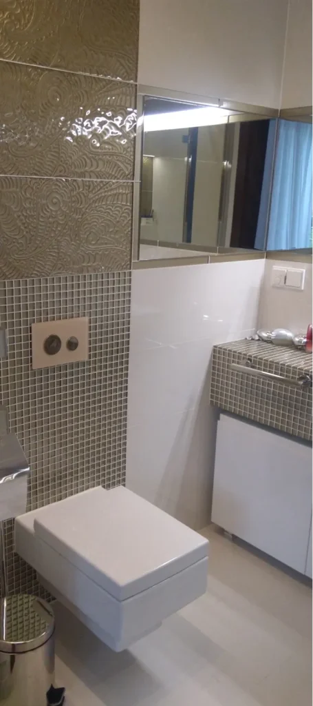 Projekt minimalistycznej łazienki – biel, beż, mozaika i lustra, projekt i porady techniczne na podkarpaciu - architekt wnętrz Ilona Niziołek