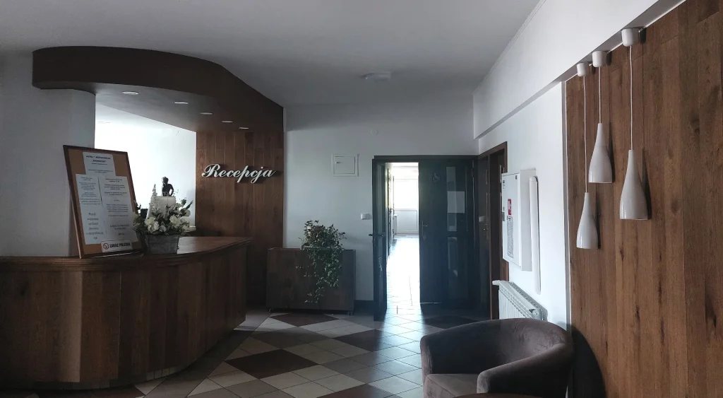 Elegancki styl recepcji w hotelu. Przytulna atmosfera. Modernizacja istniejącego wnętrza z elementami kontrastującymi drewna w ciemnym kolorze i płytek ułożonych w szachownicę. W centralnym punkcie znajduje się recepcja.